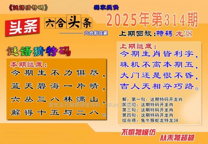 313期 今期生肖皆利字 珠机不离本期五 大门还是很不昏 吉人天相夺巧路 解译:大门还是很不昏指大肖牛马羊狗虎猪,吉人天相夺巧路指天肖牛马龙羊猴猪 九肖:牛马羊狗虎猪兔龙猴 特码:17.29.24.36.23.35.20.32 16.28.19.31.15.27.26.38 |